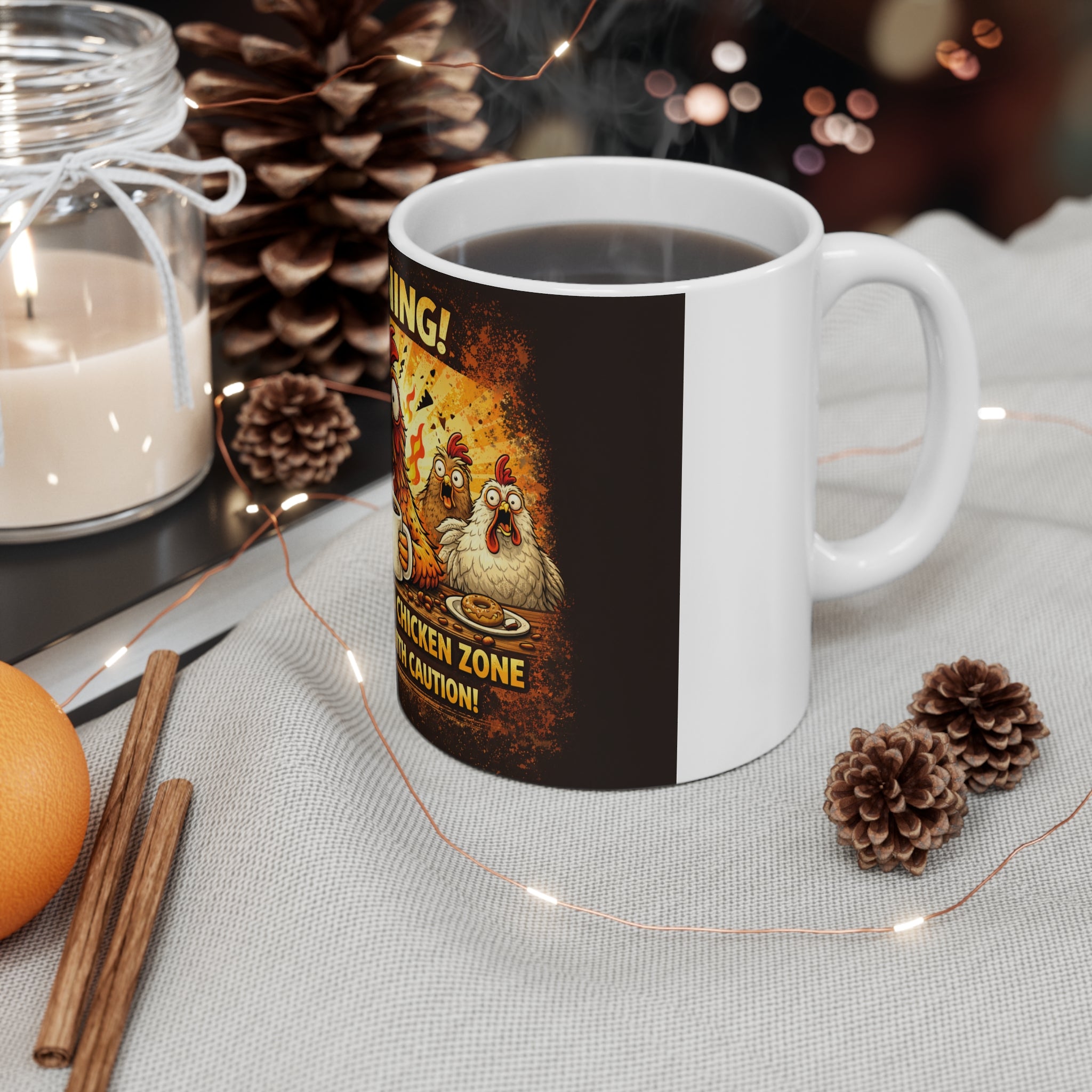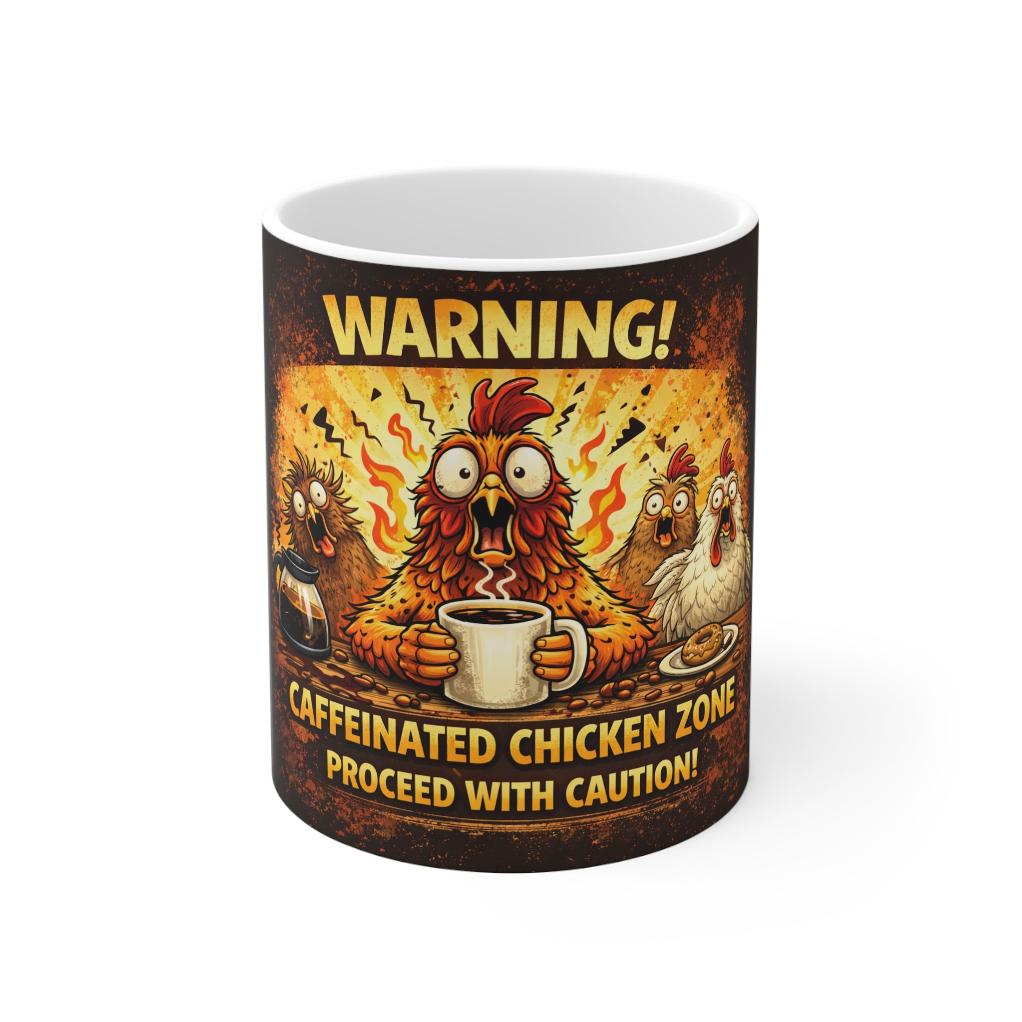 Start your day with a bold dose of caffeine and comedy. The Warning! Caffeinated Chicken Zone Mug is made for early mornings, farm-fresh routines, and anyone who shouldn’t be spoken to before their first cup of coffee. Featuring wickedly funny, vintage-style artwork, this mug showcases a wide-eyed rooster gripping a steaming mug, surrounded by jittery hens and a fiery backdrop—like a tongue-in-cheek warning sign for the caffeine-dependent.